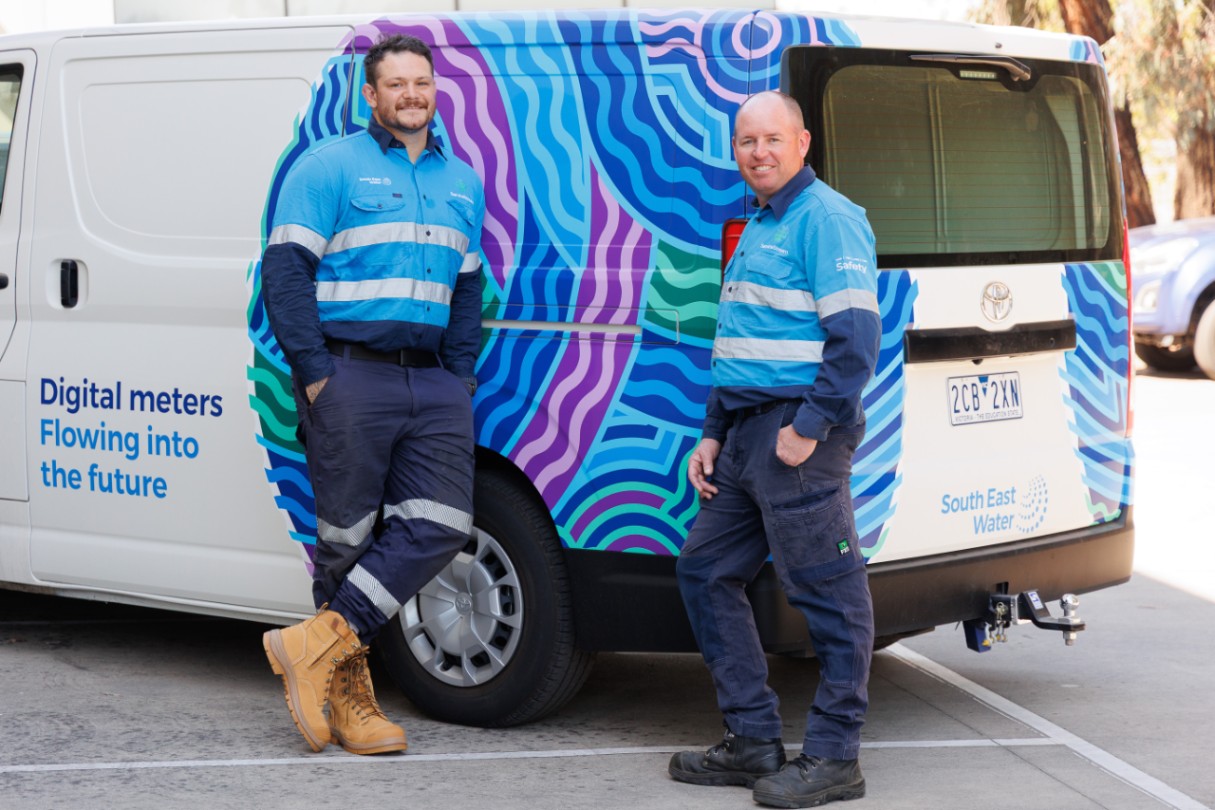 Photo 1: South East Water employees showcasing new Aboriginal artwork on digital metering van.