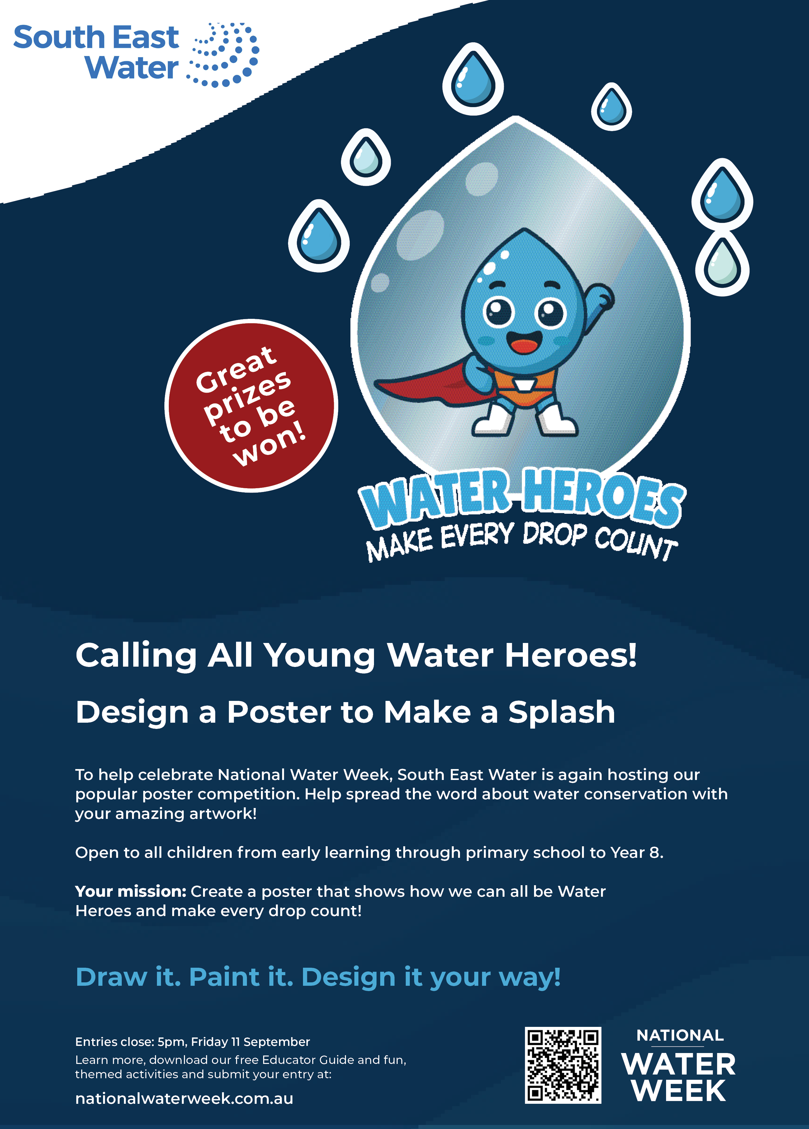 We’re thrilled to again be supporting the National Water Week poster competition. The theme for 2026 is ‘Water Heroes: Make Every Drop Count’, which highlights the important role we can all play in using water wisely.