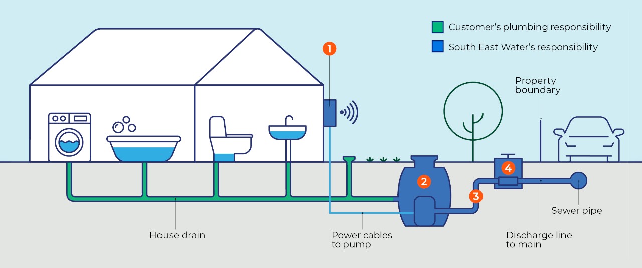 Important: All parts of the pressure sewer system belong to South East Water and are looked after by our trained team. Please don’t try to move, adjust, or fix anything yourself. Only our authorised staff should do any work on the system.
