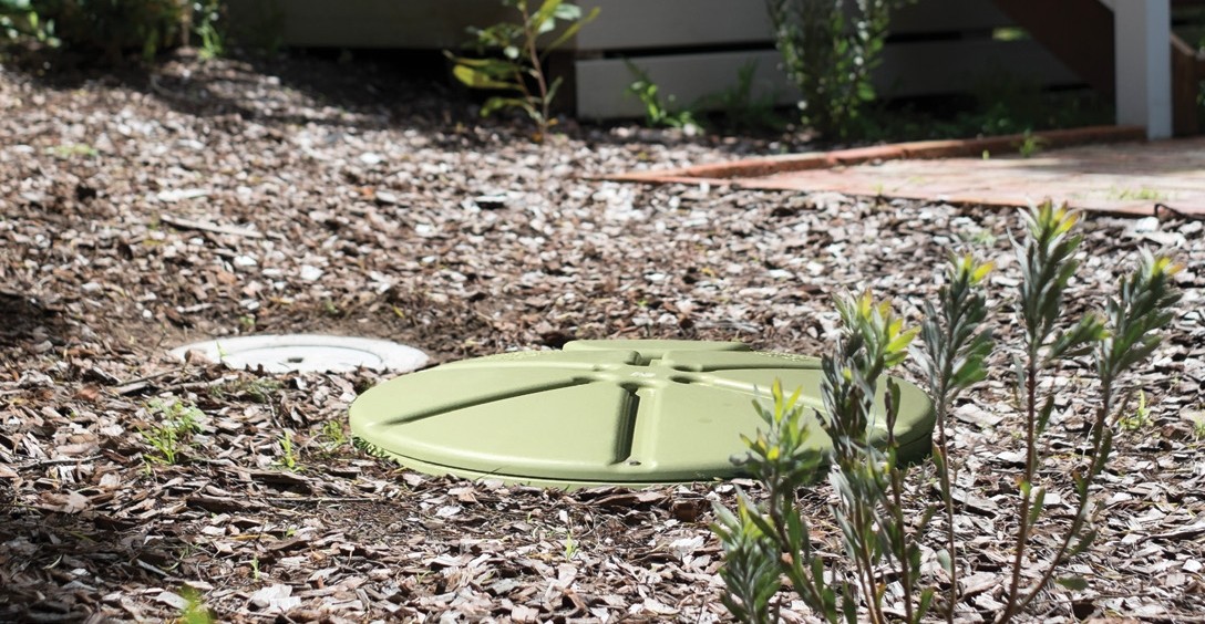 2. Pressure sewer unit - underground tank with electric pump and level monitors - only the lid is visible for servicing.