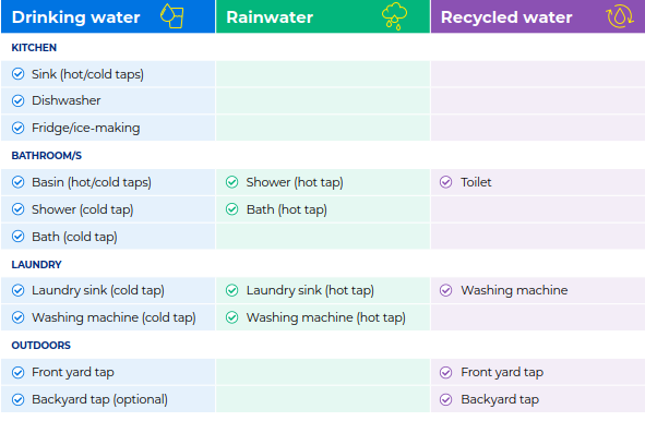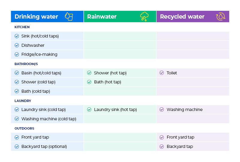 Drinking water will be supplied to hot and cold taps in the kitchen and bathroom sinks, the cold taps in your shower, bath, laundry trough and washing machine, fridge/ice-making device, and dishwasher. (If you choose, it can also supply cold water to a backyard tap.) It will be the same drinking water as that delivered across metropolitan Melbourne.