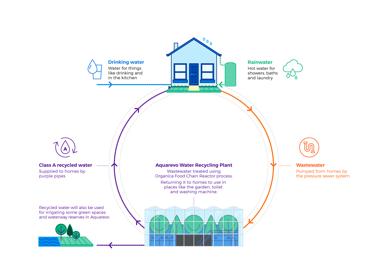 All wastewater from the Aquarevo community will eventually be recycled through an on-site water recycling plant. It will treat wastewater from all houses in the development and return it as Class A recycled wastewater for use. Learn more about the Aquarevo Water Recycling Plant project here.