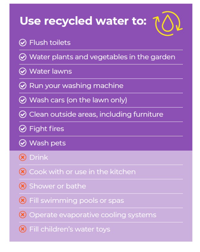 Recycled water is supplied to your toilet, front and back yard taps, as well as the option to connect your washing machine to recycled water. All recycled water pipes and taps are coloured purple, as is standard across Australia. You can use recycled water for flushing toilets, watering the garden, running your washing machine, washing cars on the lawn, cleaning outside areas and outdoor furniture, washing pets and fighting fires.