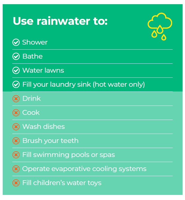 Rainwater is supplied to hot taps in your shower, bath and laundry via the rain-to-hot water system. If you accidentally swallow some water in the shower or bath there’s nothing to worry about. Your smart rain-to-hot system has treated the water to a very high standard and won’t cause you any harm.